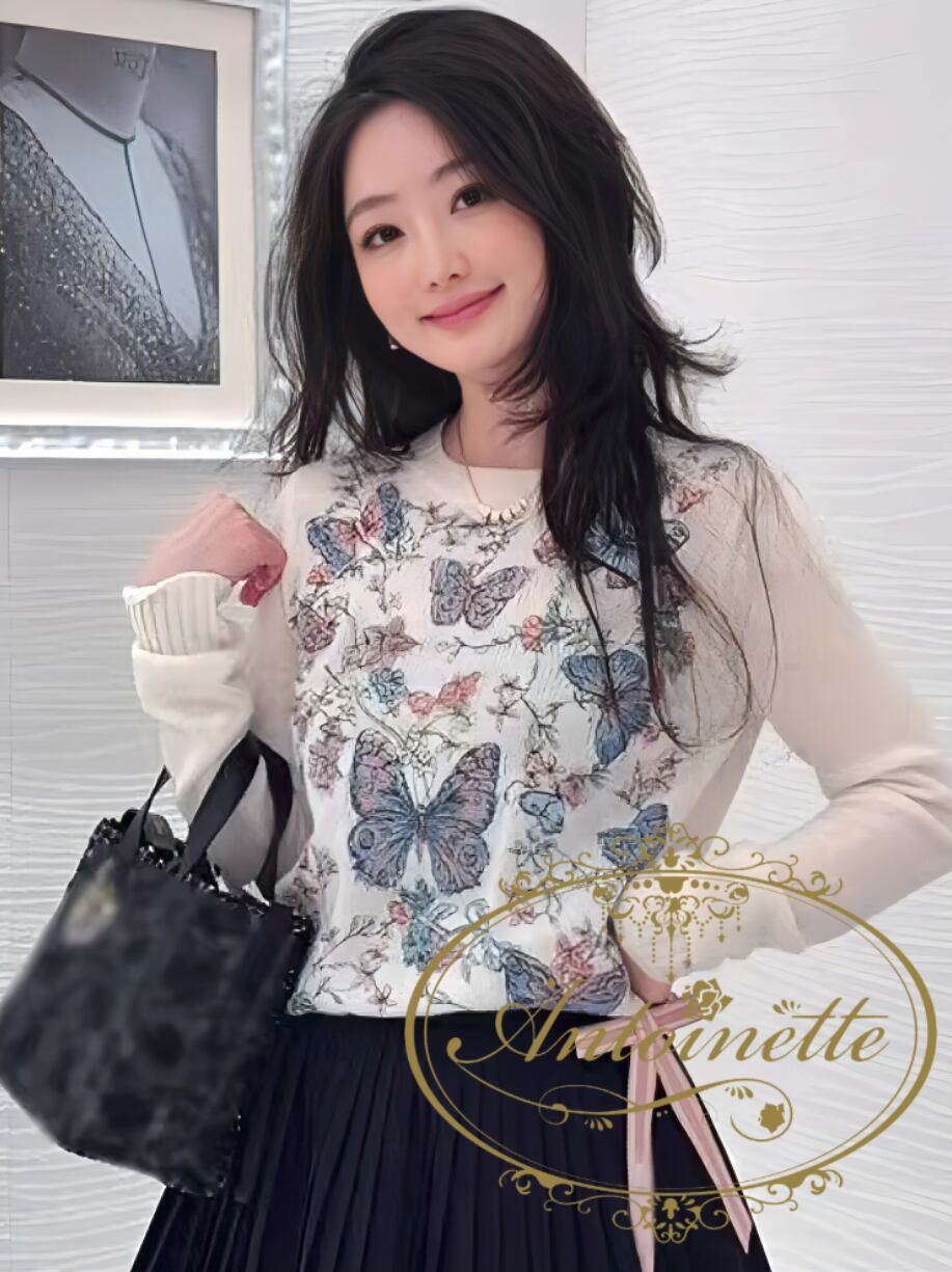 S~L レディース 長袖 秋 刺繍 ニット 大人 エレガント uネック バタフライ 蝶々 繊細刺繍