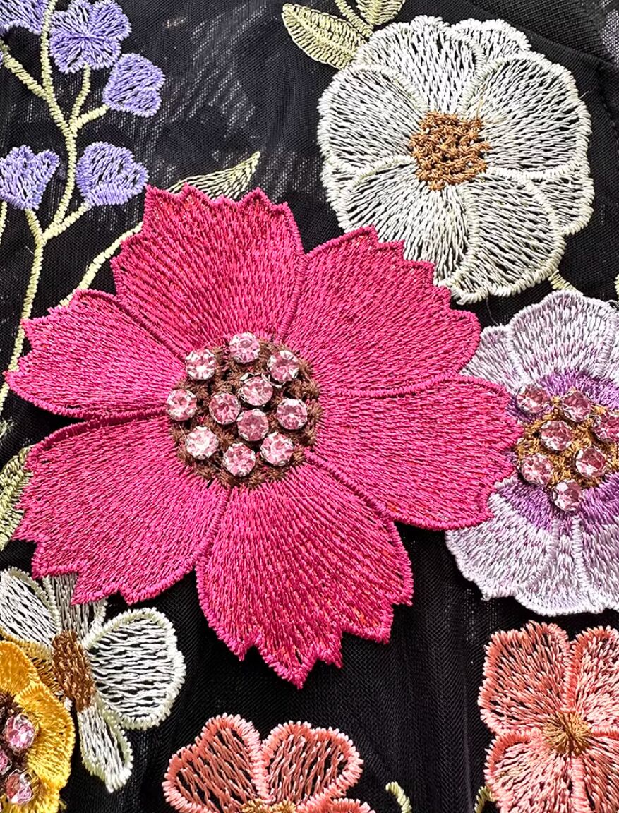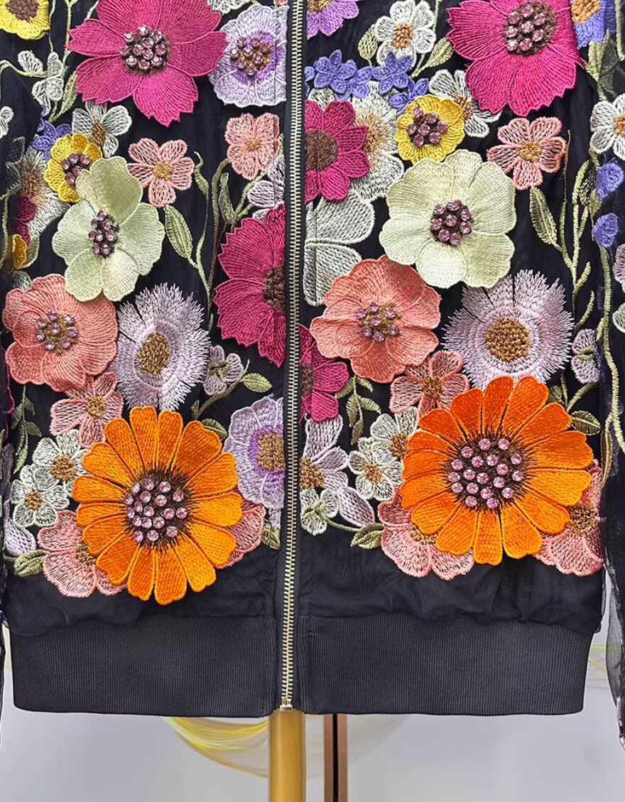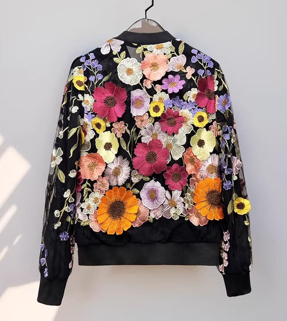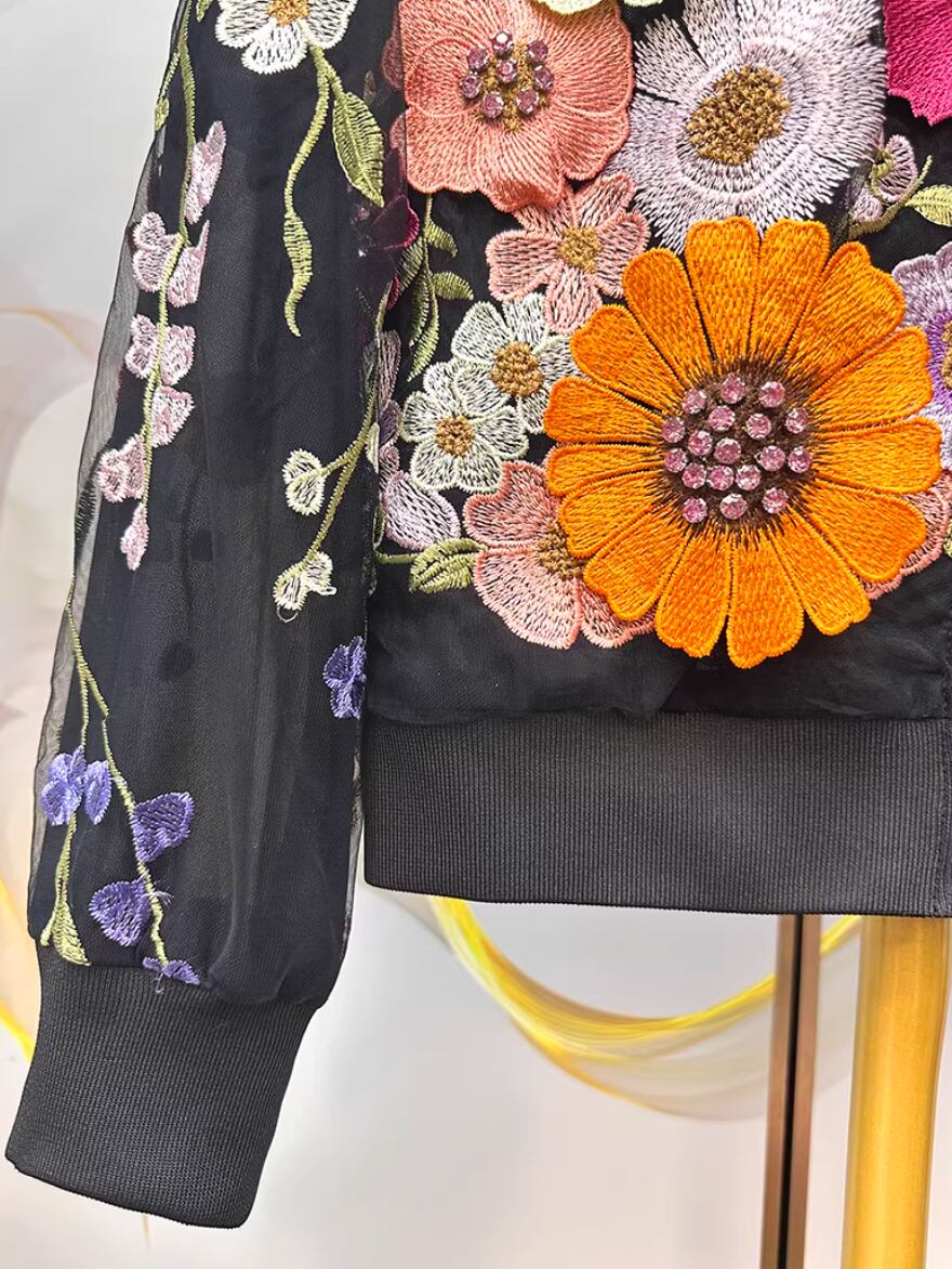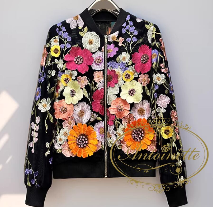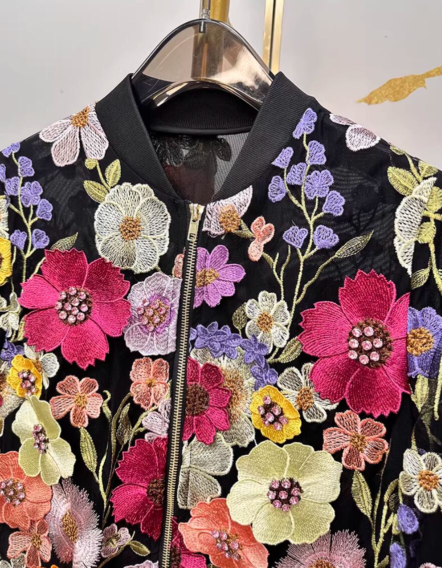 大人 春 立体 ボタニカル 羽織物 刺繍 花柄 ジャケット ブルゾン スタジャン風 派手 ゴージャス ジャンパー ショート丈 アウター 長袖 立て襟 レディース