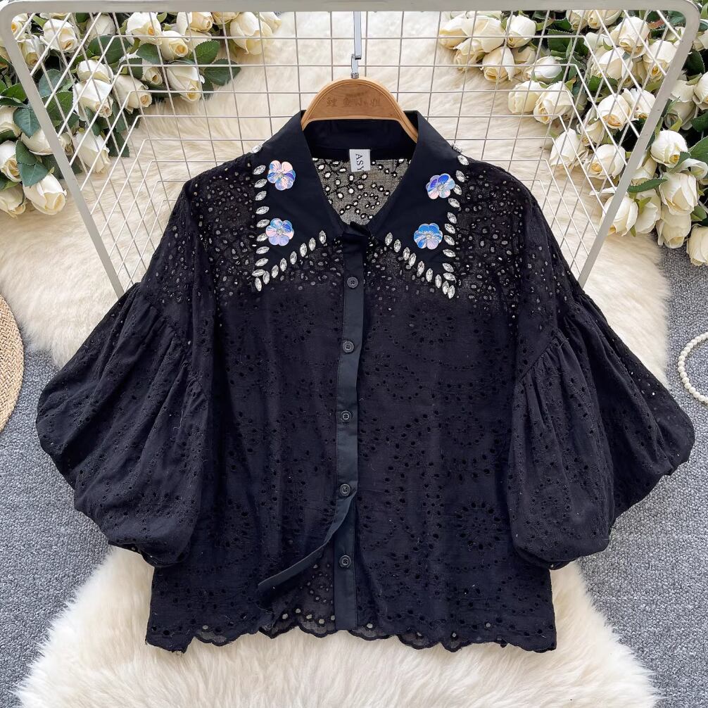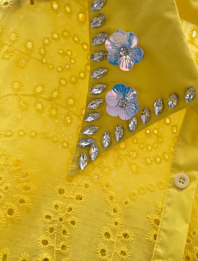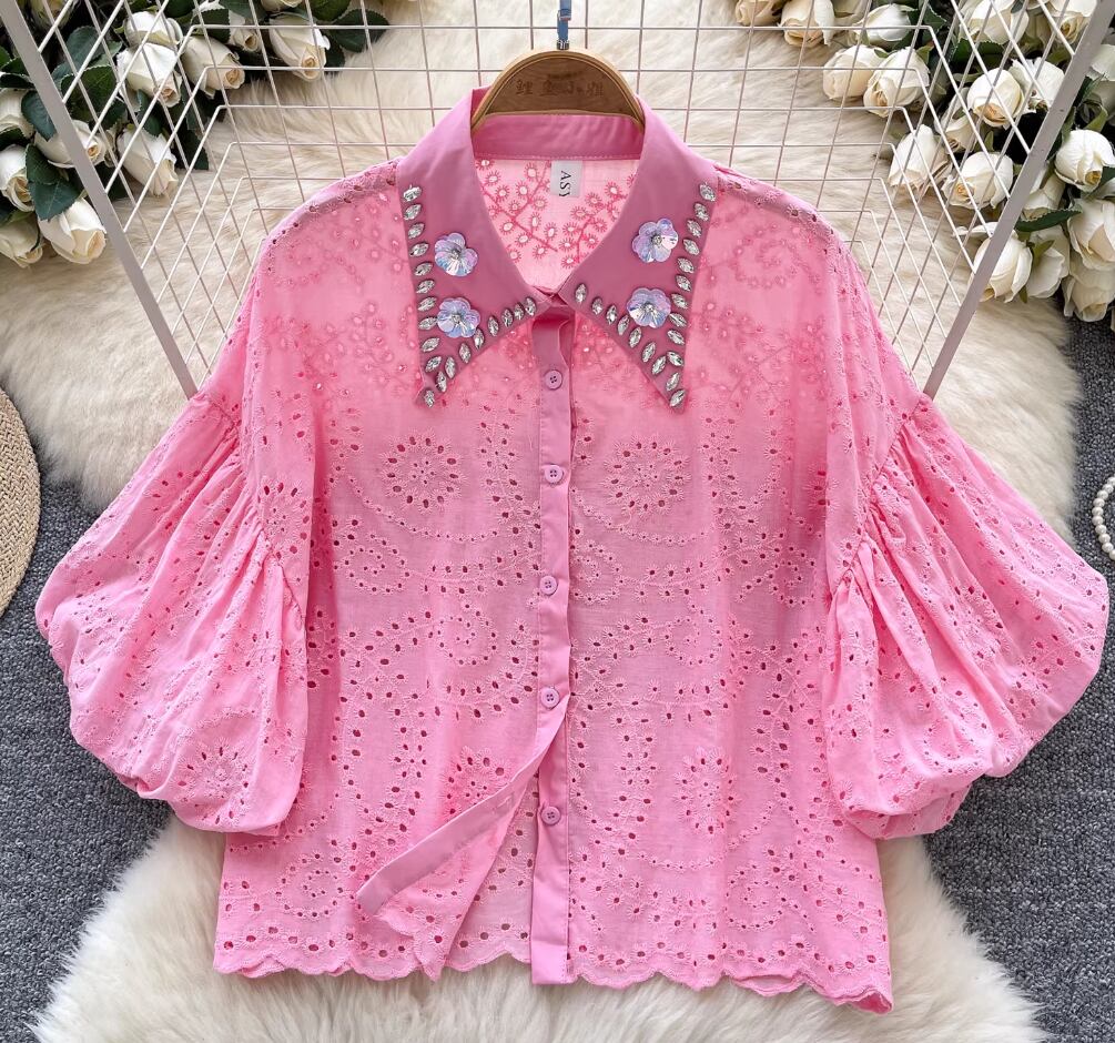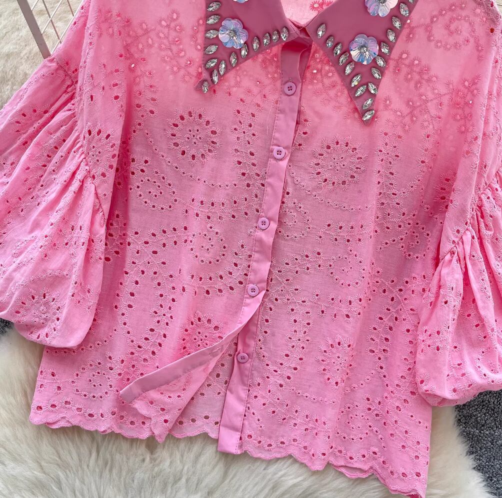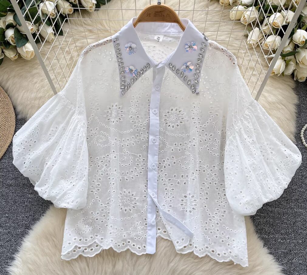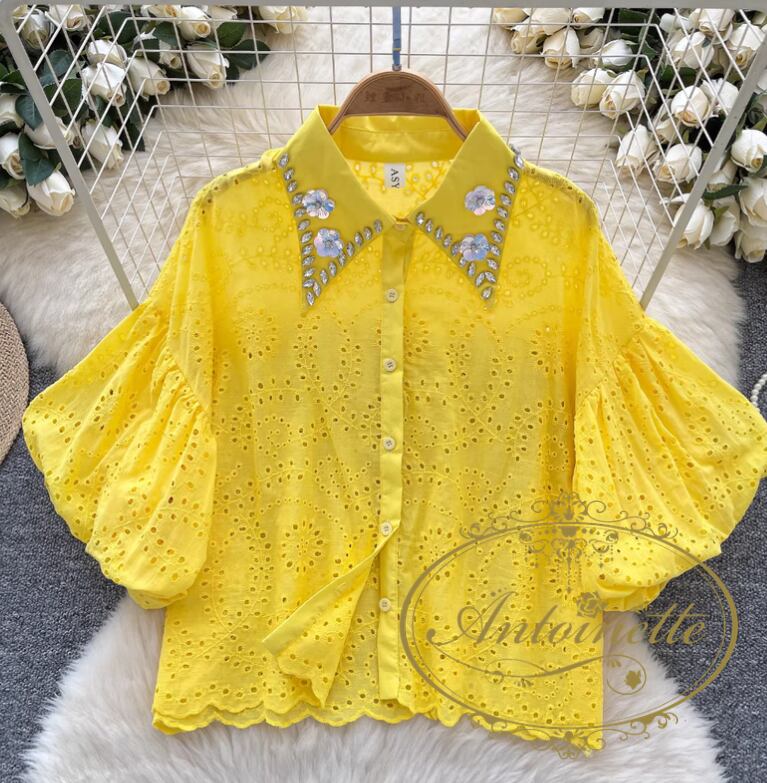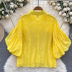 4カラー ブラウス ワンサイズ イエロー・ピンク・ホワイト・ブラック スカラップ刺しゅうレースブラウスVネック レディース 大人可愛い 透かし彫り 夏トップス白 おしゃれプルオーバー 透け感 パンチングレース ペプラムブラウス半袖